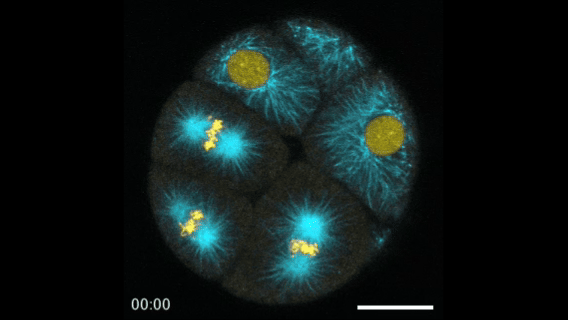 Synchronized furrow ingression between two neighboring mitotic cells (confocal z-slice recored at