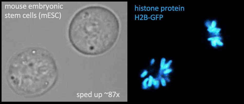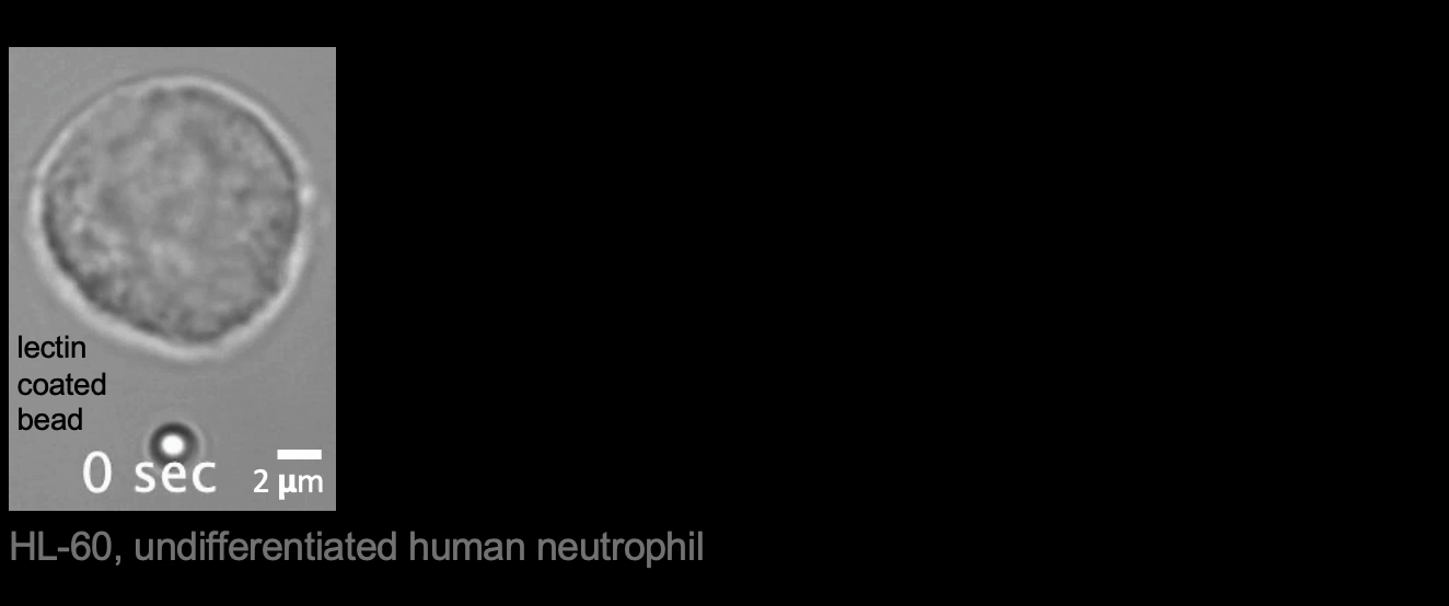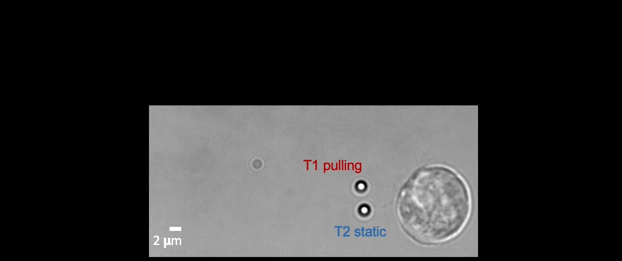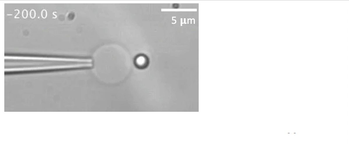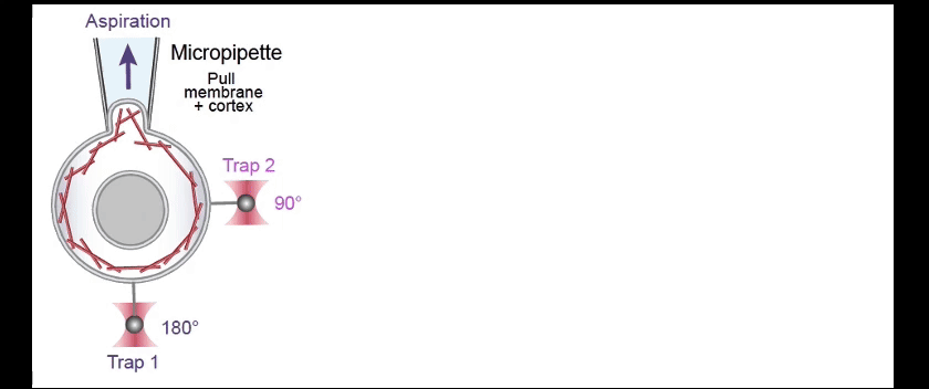 Recently, we succeed to study live cells force dynamics using adaptive high-resolution optical tweezers integrated with confocal fluorescence imaging module. In collaboration with the Weiner Lab at UCSF, we implemented optogenetic controls to modulate cellular activities on our force-probing/physical-manipulating platform (optical trapping plus micropipette aspiration; see videos above), which allows us to mechanically perturb the cells and simultaneously measure cellular forces such as change in membrane tension. We discovered that actin-driven protrusions/contractions in live human neutrophils generate rapid long-range membrane tension propagation across the cell, a property essential to the establishment of cell polarity during migration, and settled a long dispute in the field. This work also reveals that our membrane tether assay serves as an incisive approach to non-invasively resolve cortical tensions inside the cell, which becomes the rigorous basis to launch our studies on cortical dynamics during mitosis. By customizing our microfluidic setup, we expand the variety of cell types amenable to our system, ranging from mouse embryonic stem cells (mESCs) to an actively dividing sea star embryo (collaboration with the Barone Lab at Stanford).